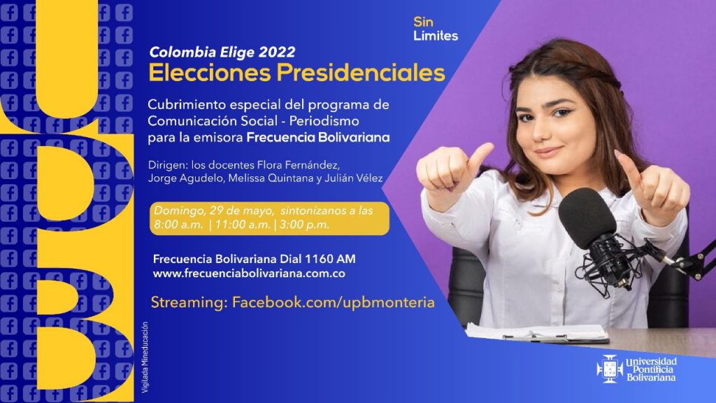 A través de Frecuencia Bolivariana puedes sintonizar el cubrimiento especial #UPBinforma que realiza el programa de Comunicación Social – Periodismo de la Universidad Pontificia Bolivariana seccional Montería y que dirigen los docentes y comunicadores: Flora Fernández, Jorge Agudelo, Melissa Quintana y Julián Vélez.