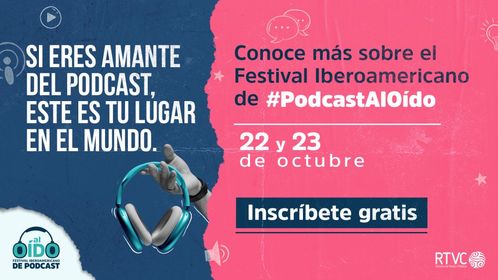 Convencidos de que la industria emergente del podcast en español necesita espacios de reflexión y conexión, RTVC Sistema de Medios Públicos de Colombia abrió un espacio para construir comunidad, ofrecer inspiración, apoyo y generar diálogos, con actividades a realizarse durante todo el año, y que tiene como cumbre el Festival Iberoamericano de #PodcastAlOído, cuya tercera edición se realizará el 22 y 23 de octubre, por primera vez, con una programación mixta: virtual y presencial.