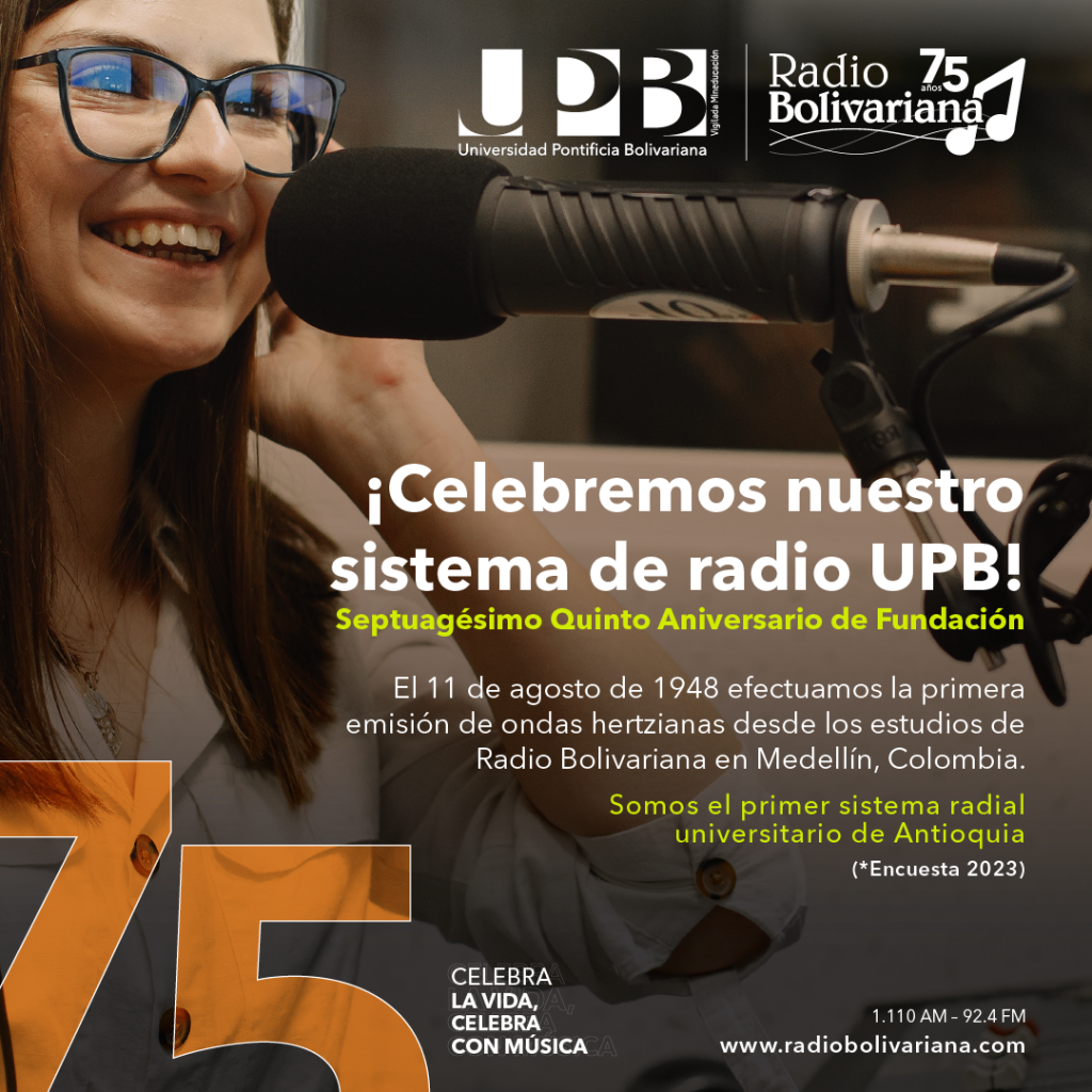 El 11 de agosto de 2023 se cumplen 75 años de la primera emisión de ondas hercianas a través de Radio Bolivariana, la Emisora Cultural y primer sistema de radio universitario de Antioquia. Con sus radiofrecuencias 1.110 AM y 92.4 FM; servicios streaming, podcast y replicadores digitales, el sistema radial de la Universidad Pontificia Bolivariana sede Medellín, es hoy un referente en la promoción de los valores sociales, cristianos y culturales, en la visibilidad de su alma mater y en la transferencia de conocimiento hacia la comunidad en la región y el mundo.