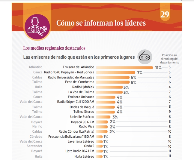 La Red de Radio Universitaria de Colombia, RRUC, felicitó a las emisoras universitarias que se destacaron en el estudio a nivel Nacional y Regional. “Felicitamos a las siguientes emisoras, sus directores(as) y sus equipos informativos, por estar entre los más consultados. A nivel regional: Radio Universidad de Manizales, Emisora Unicauca, Univalle Estéreo, Radio Cóndor en Manizales, Frecuencia Bolivariana 1160 AM en Montería, Javeriana Estéreo Cali y UPTC Radio en Tunja. A nivel nacional: Javeriana Estéreo Bogotá y Radio UNAL Bogotá” señala Fernando Rivera, Secretario General de la RRUC.