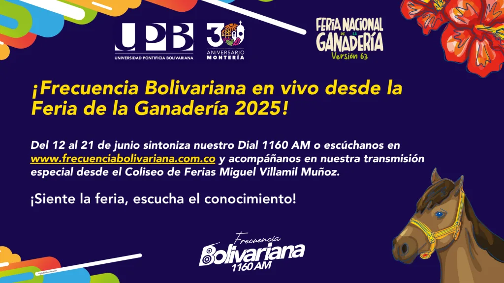 La emisora universitaria Frecuencia Bolivariana, comprometida con la divulgación del conocimiento, la cultura y el desarrollo regional, se une como aliada estratégica al evento académico Alianzas que Construyen, liderado por la Universidad Pontificia Bolivariana en el marco de la Feria de la Ganadería 2025. Una vez más, la radio universitaria se convierte en puente de saberes, llevando a su audiencia las voces que construyen región.