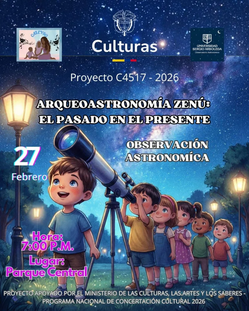 El viernes 27 de febrero de 2026, el municipio de San Andrés de Sotavento, Córdoba, será testigo de un evento único en Colombia, donde niños y adultos podrán ver el cielo como nunca antes, gracias al proyecto C4517-2026 “Arqueoastronomía Zenú”, apoyado por el Ministerio de las Culturas, las Artes y los Saberes y desarrollado con el Observatorio Astronómico de la Universidad Sergio Arboleda.